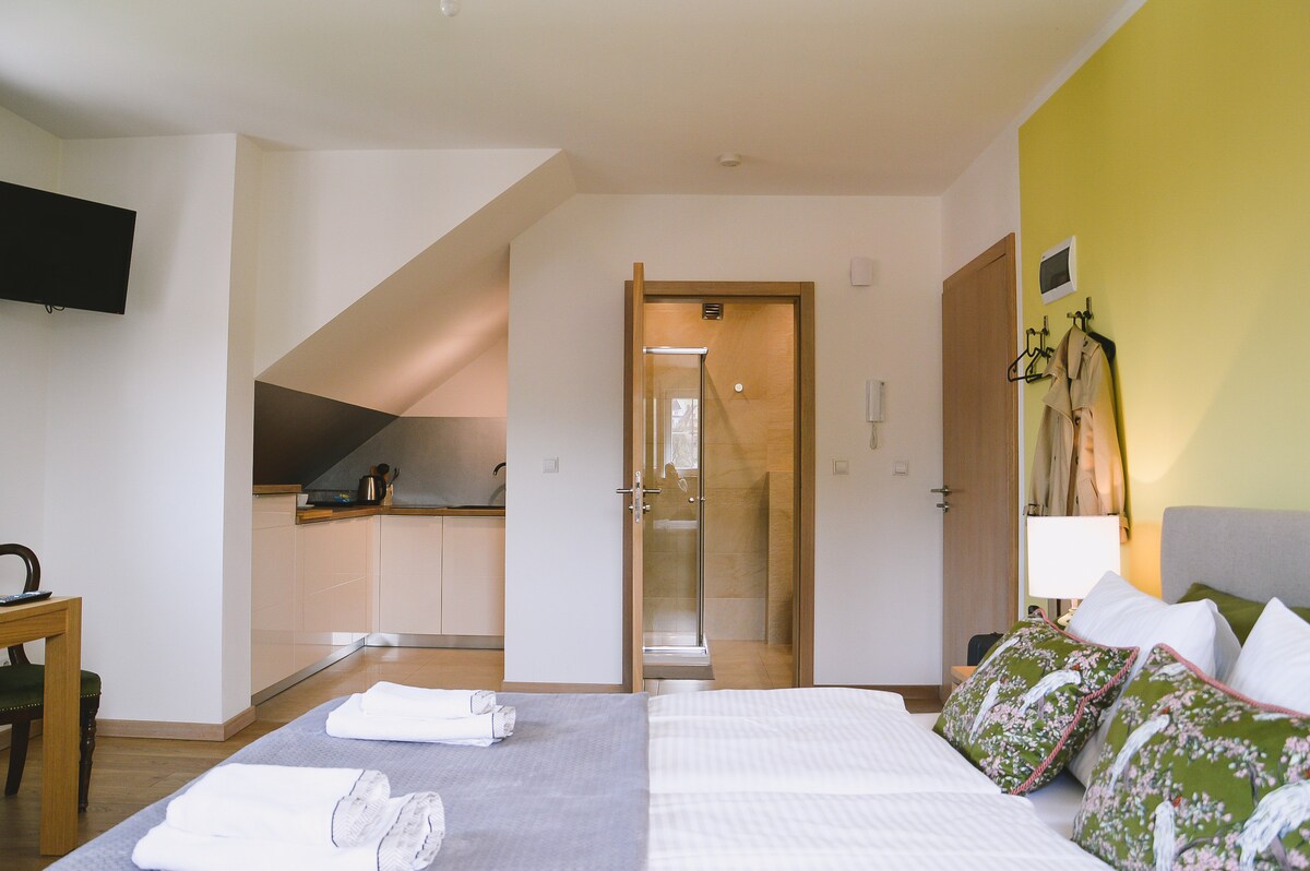 Apartament dwuosobowy , z dużym oknem i widokiem na góry , Nowoczesny styl , dbałość o szczegóły. Wyposażenie : Pościel , ręczniki , suszarka do włosów , mydło w płynie , papier toaletowy . Szafa , stół , Tv z płaskim ekranem , Aneks kuchenny , płyta grzewcza , lodówka , zlew , naczynia sztućce , szkliwo , czajnik,. Duże lustro . bezpłatny monitorowany parking. Sauna , Jacuzzi na wynajem. Odpłatnie