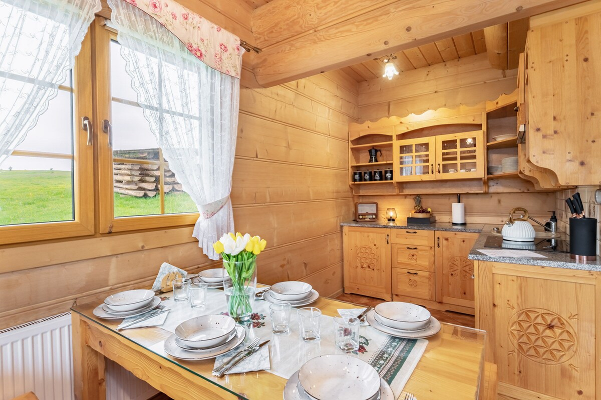 Domek został wybudowany w tradycyjny góralski sposób z naturalnych drewnianych bali na wzgórzu. Pobyt w takim domku sprawia że każdy kto chce odpocząć od pracy, zabieganego życia ma to zagwarantowane. Miejsce zlokalizowane jest w cichym , spokojny terenie zdała od zgiełku i huku miasta. Domek znajduje się sam na działce w otoczeniu zieleni drzew i pobliskich łąk na których latem i jesienią są wypasane bydła. Wnętrze oraz meble wystylizowano własnoręcznie malowanymi folkowymi motywami góralskimi.