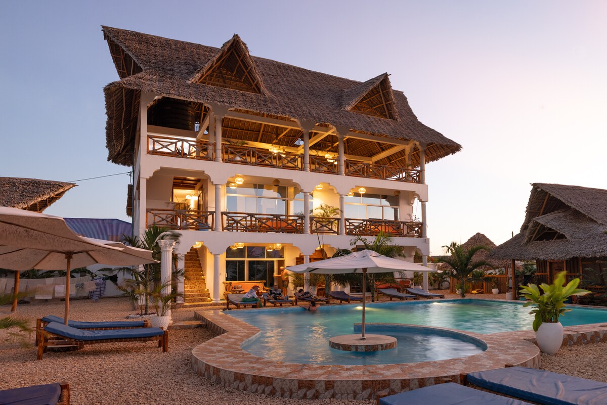 Nasz kompleks położony jest tuż przy plaży, z 4-sypialną willą z przodu i oddzielną willą z 1 sypialnią z tyłu, która jest wynajmowana oddzielnie. Nasze widoki są światowej klasy, pocztówka idealna z widokiem na Ocean Indyjski i rafę koralową wokół wyspy Mnemba. Plaża jest bardzo bezpieczna dzień i noc . W odległości spaceru od willi znajduje się kilka hoteli butikowych z barami i restauracjami. Willa ma piękny domowy klimat, a miejsce jest idealne dla par lub rodzin.