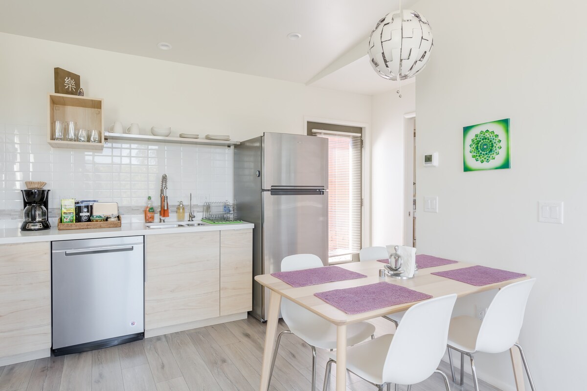 W tej jedynej w swoim rodzaju casita od razu poczujesz się jak w domu, z zachwycająco dobraną paletą kolorów i fantastycznym wystrojem architektonicznym. Naturalne drewno, kamień i metalowe materiały są pomysłowo splecione, aby stworzyć ciepło i przytulność, a duże okna i strzelisty sufit tworzą przestronność. Przygotuj kawę lub posiłki w dobrze zaopatrzonym aneksie kuchennym i zrelaksuj się na tarasie otoczonym dojrzałymi drzewami. Krótki spacer lub przejażdżka do Whole Foods, restauracji i szlaków!