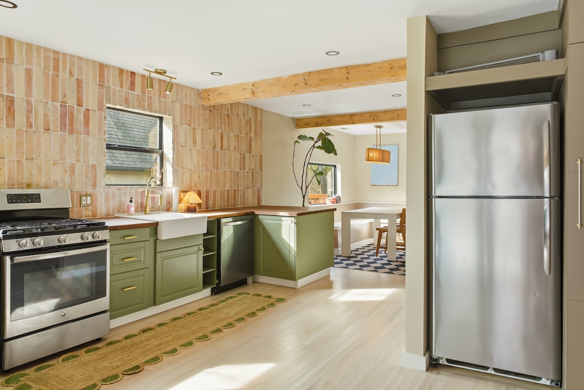 Relax, unwind with amazing views while on a romantic getaway, staycation or while working from this beautiful hidden gem! It is perfectly located close to downtown with easy access to restaurants, shopping and entertainment but far enough away to be secluded. At night, enjoy sounds of owls, frogs, cicadas and sights of fire flies. During the day, admire birds and other wildlife/nature while sipping wine or coffee on one of the 3 porches overlooking the garden and seasonal creek.
