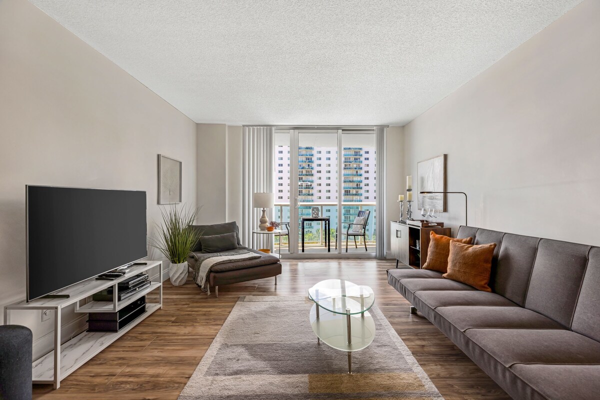 ✨Ucieknij do raju 2-pokojowe mieszkanie 1 sypialnia z łóżkiem typu king, 1 mała sypialnia z łóżkiem wysuwanym + rozkładana sofa w salonie, w pełni wyposażona kuchnia, balkon z oszałamiającym widokiem na wybrzeże. 🏖️ krótki spacer do plaży! Podgrzewany basen, siłownia, kort tenisowy, sklepik. Obejmuje kryty parking i sprzęt plażowy (krzesła, parasol, lodówkę). Bezpłatny autobus do Aventura Mall, przed budynkiem znajduje się park z placem zabaw dla dzieci i boiskiem do sportu.🌴 STR-00608