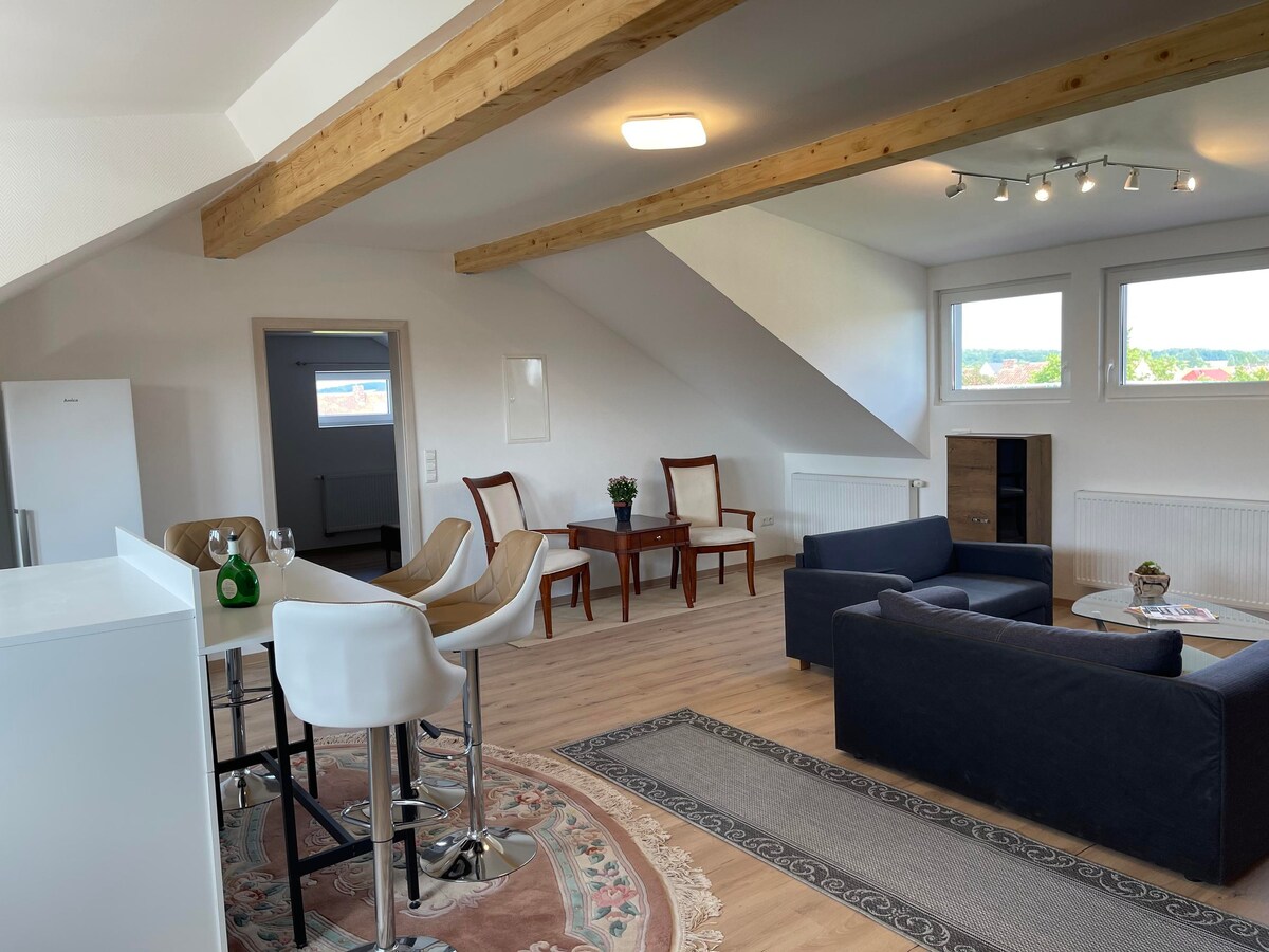 Wynajmuję swój wynajem wakacyjny w nowym budynku (gotowy od 1 marca 2018 roku). W apartamencie znajduje się salon i jadalnia z otwartą kuchnią i sypialnią. W łazience jest wanna i prysznic. Lengfeld to dzielnica Würzburga, do centrum miasta można dojechać w ciągu 20 minut z dobrym połączeniem autobusowym. Śniadanie jest również dostępne w naszym Gasthaus Zum Hirschen z własnym sklepem mięsnym w razie potrzeby. (10,80 za osobę)