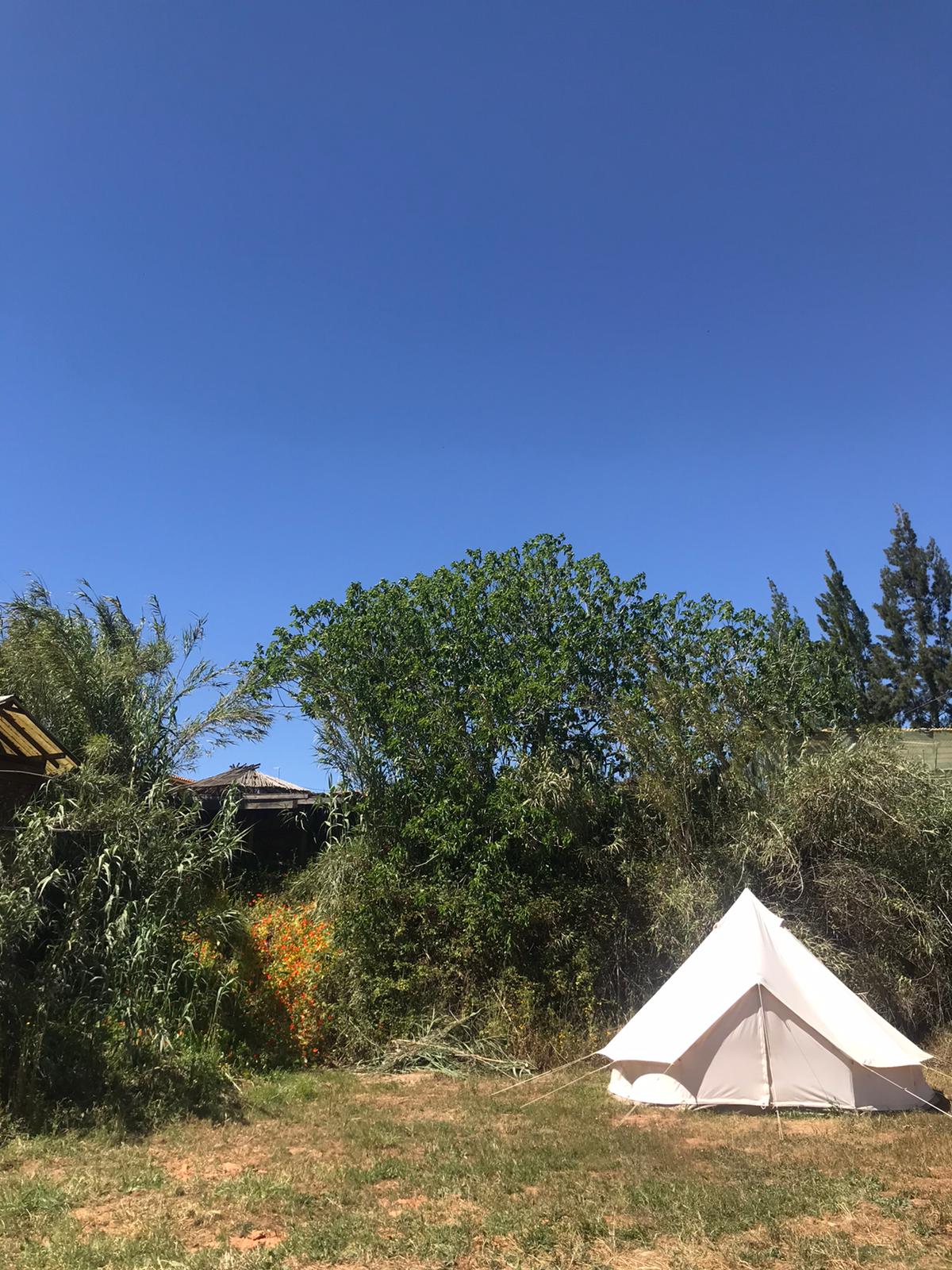 Namiot glampingowy na łonie natury, wyposażony w 2, 3 lub 4 materace na podłodze, pościel, elektryczność i krzesła do relaksu na zewnątrz. Współdzielona łazienka znajduje się około 30 metrów od namiotu. 100 metrów dalej znajduje się wspólna kuchnia wyposażona w garnki, naczynia, sztućce, toster i małą przestrzeń we wspólnej lodówce, aby utrzymać świeżość składników. Wspólny basen znajduje się 150 metrów dalej i możesz z niego korzystać podczas pobytu.