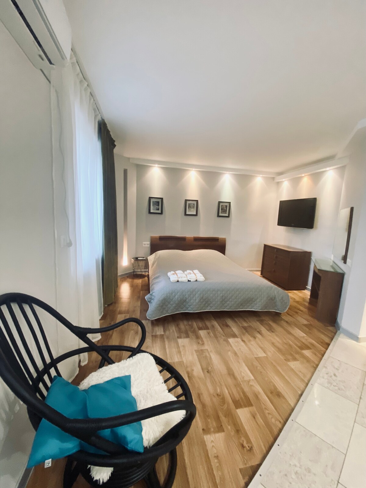 Sea&Sky Apartments to wyjątkowy designerski apartament w Odessie. Ogólny styl i każdy szczegół wnętrza został zaprojektowany i przemyślany przez nas osobiście. Wysokiej jakości meble i hydraulika, drogie akcesoria i niepowtarzalny design. Każdy apartament to osobny autorski projekt marki Sea&Sky Minimalistyczne wnętrze zaprasza na wypoczynek w apartamencie. Słoneczna przestrzeń i proste zwięzłe rozwiązania, a także widok na morze - wszystko, czego potrzebujesz dla przyjemności estetyki.