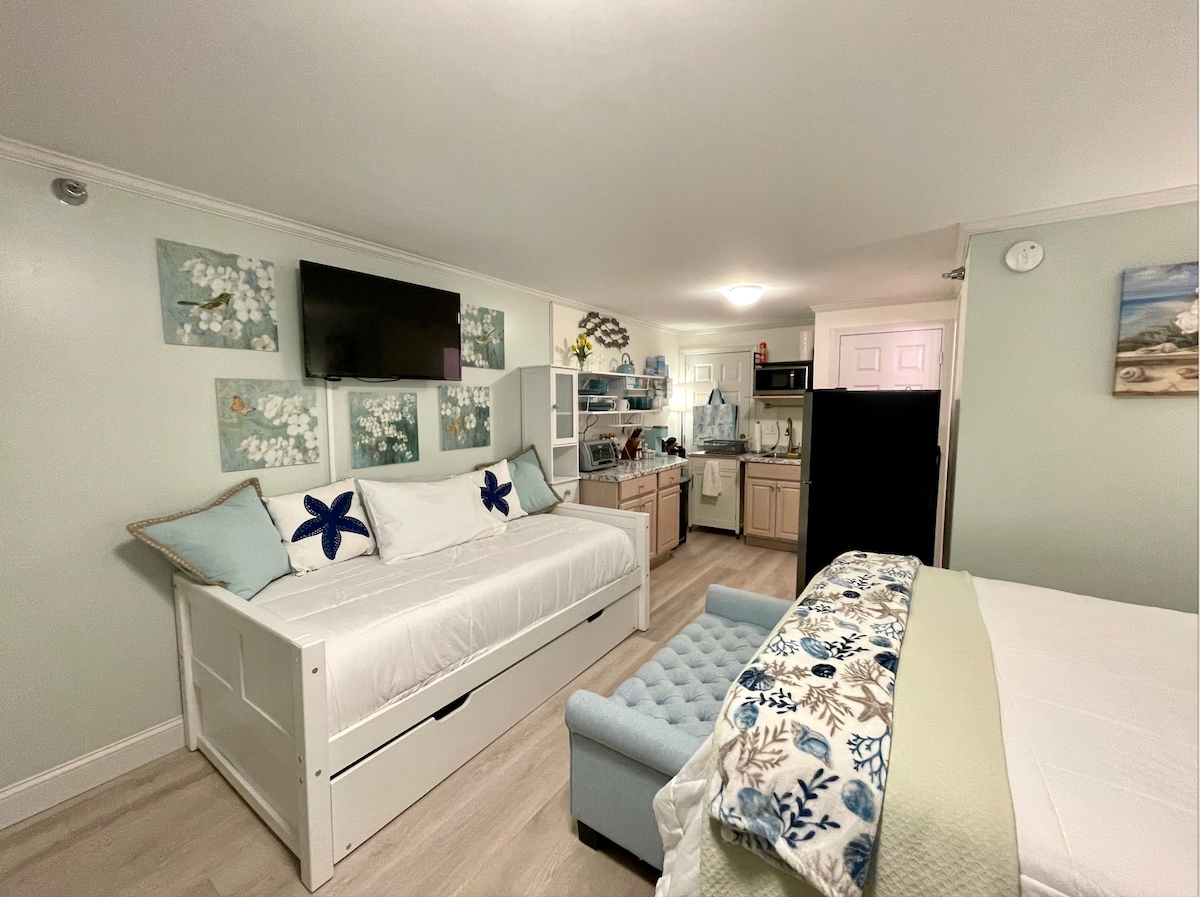 Jest to apartament z jedną sypialnią i własną prywatną łazienką w pobliżu Wells Beach oraz Route 1 Shopping, restauracje itp. Szybkie Wi-Fi, klimatyzacja/ogrzewanie, wygodne łóżko queen size, mini-lodówka, mikrofalówka, stół z 2 krzesłami, wentylator sufitowy, apteczka, żelazko i suszarka. Latem nie oferuję wynajmów długoterminowych, ale napisz do mnie, jeśli chcesz przyjmować gości na pobyty długoterminowe od października do maja.