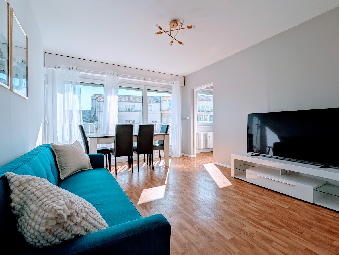 Jasne i przytulne, to 3-pokojowe mieszkanie znajduje się w zabytkowej dzielnicy Metz Vallières, oferując piękny widok na okolicę i kościół Saint-Lucie. Mieszkanie dla niepalących z Wi-Fi, w pełni wyposażoną kuchnią, wygodną częścią dzienną z telewizorem, łazienką i pralką. Doskonała lokalizacja: blisko autostrad A4/A31 i szpitala Roberta Schumana, zaledwie 7 minut od dworca kolejowego i centrum miasta oraz 9 minut od parku wystawowego. Bezpłatny parking jest dostępny 150 m od pr