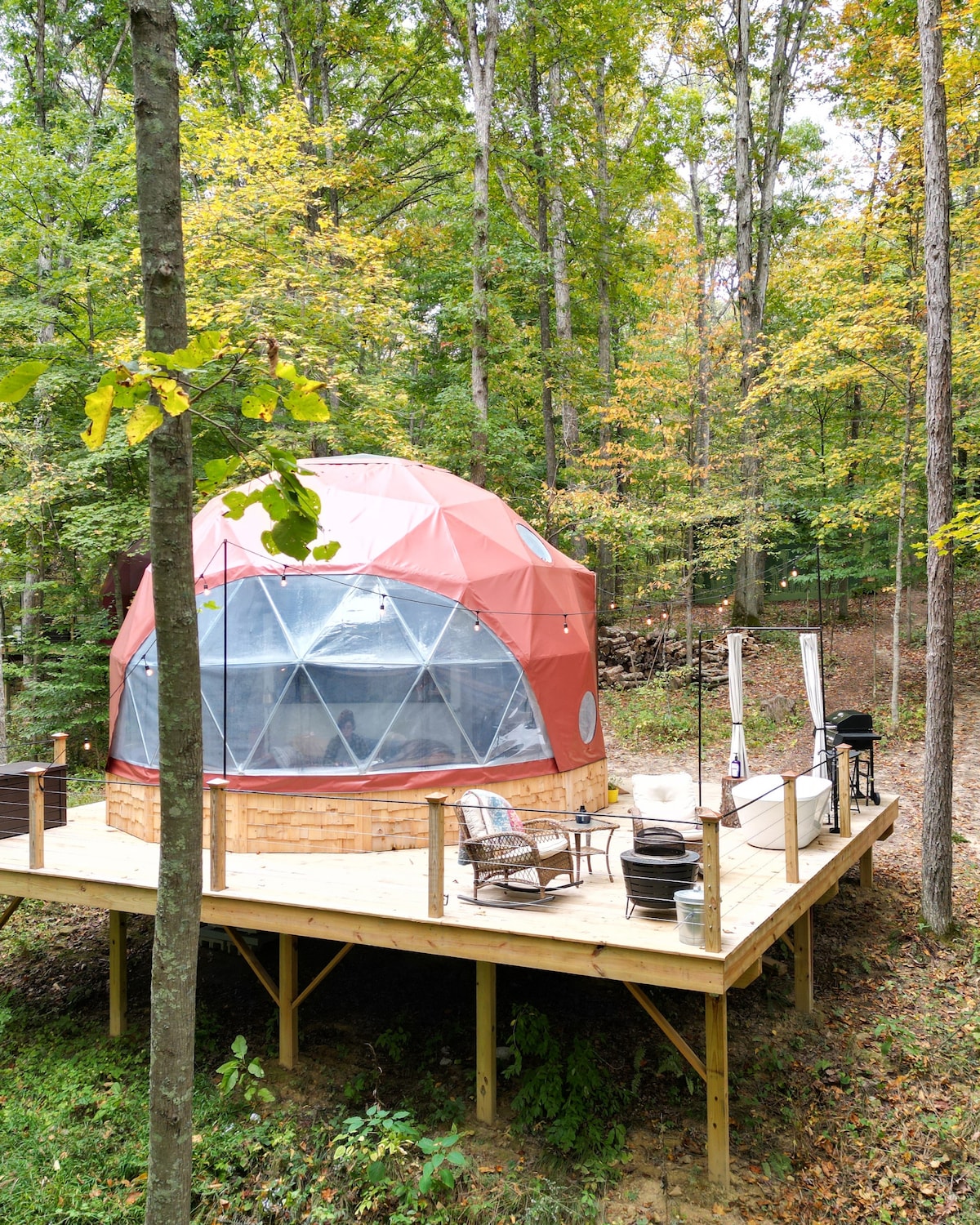 The Eclipse Glamping Dome is the perfect getaway to experience nature with all the luxurious amenities. - Otwarte całoroczne ogrzewanie i klimatyzacja - Znajduje się na 7 ustronnych akrach - Bezpośredni dostęp do rzeki Mohican - Prywatna wanna z hydromasażem - W pełni umeblowany taras z paleniskiem - W pełni wyposażony aneks kuchenny - Projektor z Roku do przesyłania strumieniowego - CellularWIFI - Luksusowa łazienka - Malownicze widoki na las i rzekę - Parking utwardzony - 1,6 mili od Bridge of Dreams/Mohican Valley Trail