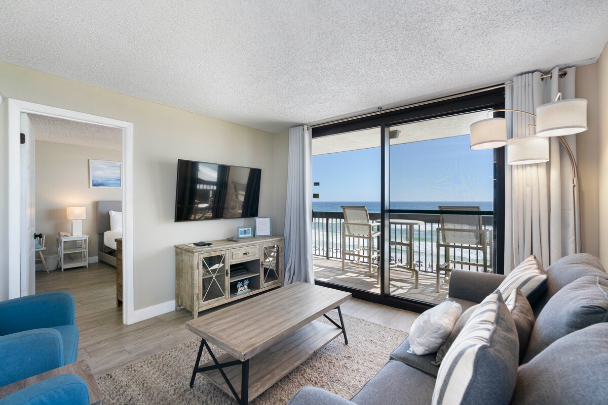 **ZAPYTAJ O NASZE SPECJALNE STAWKI SNOWBIRD od października do lutego** Ten wspaniały apartament ma łatwy dostęp do wszystkich atrakcji Destin! Rozkoszuj się widokiem na basen i plażę z dużego, PRYWATNEGO balkonu na 7. piętrze. Pralka i suszarka w apartamencie z nowymi meblami. Wysokiej klasy zasłony zaciemniające z wyjściem na balkon z głównej sypialni i salonu. Bistro, restauracja i bar są usytuowane na dole. Bezpłatny parking i transport na plażę. Concierge i ochrona. Plaża w odległości spaceru!