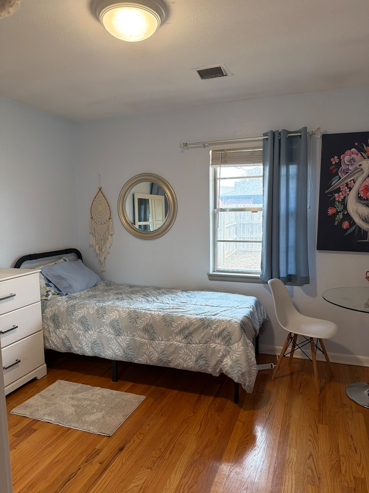 Relaksujący wypoczynek w jednopokojowym domku gościnnym. Zostań i gotuj nad jeziorem lub w modnych restauracjach lub barach w pobliżu. Atrakcje takie jak centra handlowe, Chisholm Creek, Top Golf, Main Event i inne ciekawe miejsca w odległości 5 minut. Bricktown w 15 minut jazdy. W pobliżu lokalnych uniwersytetów. Prywatny pokój w kabinie o powierzchni 800 stóp (za głównym domem) z lodówką, piekarnikiem/kuchenką, kuchenką mikrofalową, idealny na wakacje lub pracę. Duże biurko do rozkładania projektów, wspierające kreatywność z niesamowitym widokiem na jezioro.