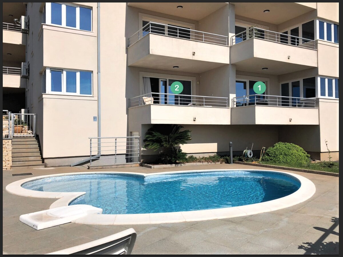 Ładne, nowoczesne, w pełni wyposażone apartamenty B (118 m2) w Villa ❤ Love (dla 6 osób) ze wspaniałym widokiem. Posiada ładny prywatny taras na dachu z jacuzzi, leżakami, stołem, grillem, prysznicem, mini kuchnią i lodówką. Położony 170 metrów od morza. Basen znajduje się na parterze i jest dzielony z apartamentami A i C. Parking na terenie nieruchomości. Ładna i spokojna okolica! Cała Villa ❤ Love z 3 apartamentami dla łącznie 20 osób (6 osób w A, 6 osób w B, 8 osób w C) można wynająć ode mnie. Wystarczy zapytać!