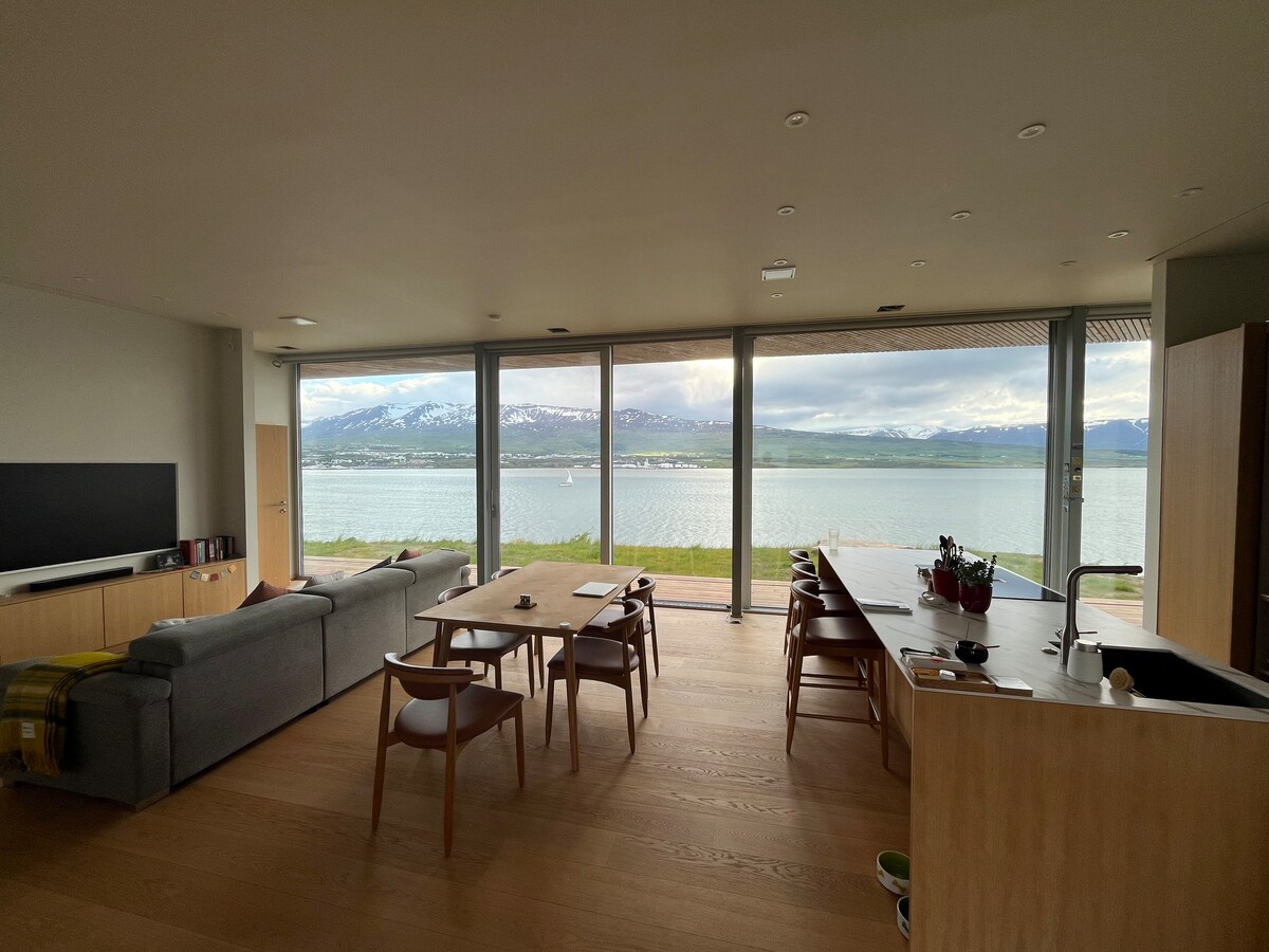 Situated on the beautiful, peaceful island of Hrísey in the middle of Eyjaförður. The house sits on the water's edge with stunning views of the fjord and mountains where you can sometimes watch the whales and dolphins. PLEASE NOTICE: The island is located in the northern part of Iceland. It is a five-hour drive from Reykjavik. And you need to take a ferry to get there. No cars, pedestrians only. The ferry departs from the fishing port of Árskógssandur every two hours and only takes 15 mins.