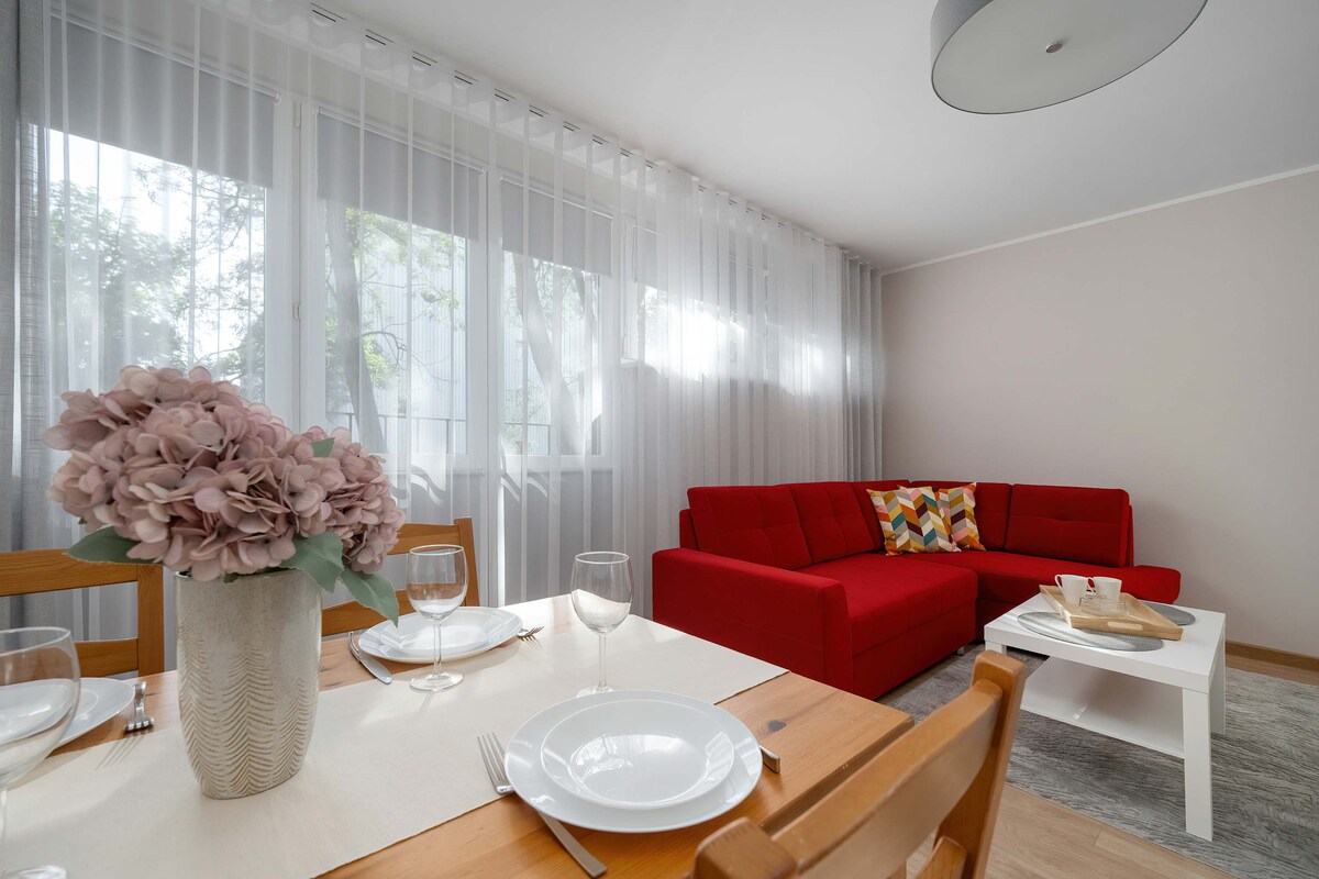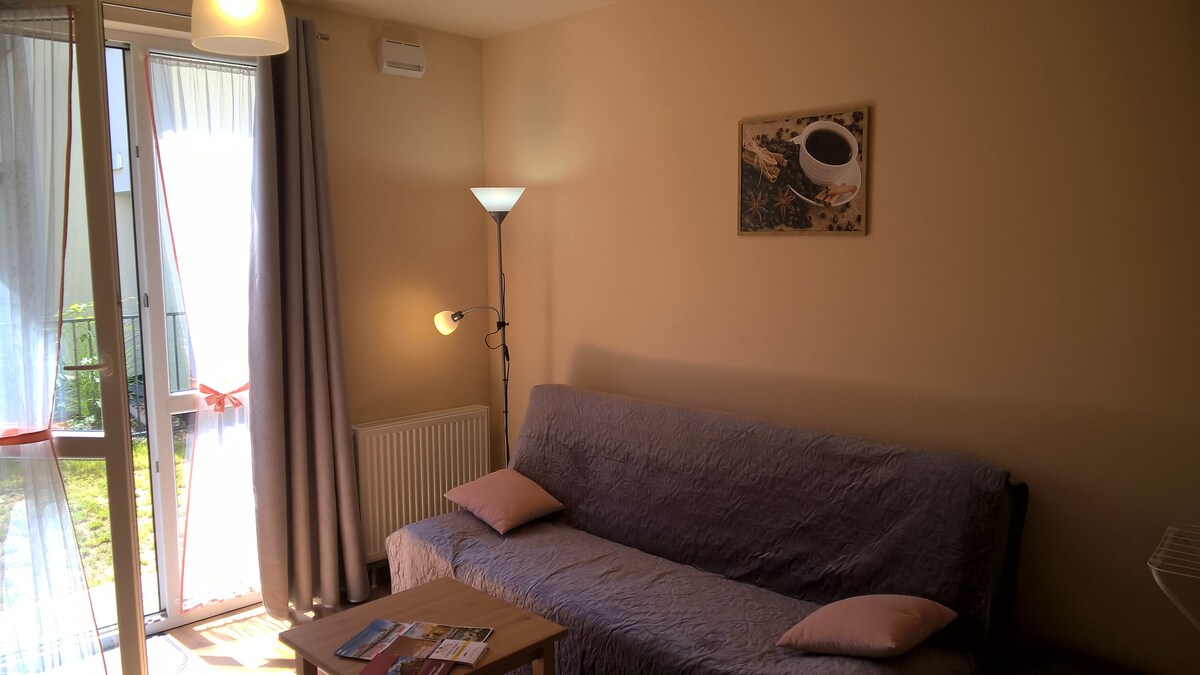 Apartament dla pary, grupy lub rodziny na nowoczesnym osiedlu: ✔ Dwie sypialnie ✔ Rozkładana, dwuosobowa sofa w pokoju dziennym (szerokość spania 140 cm) ✔ W pełni wyposażona kuchnia - zmywarka, płyta indukcyjna, piekarnik, lodówka, mikrofalówka ✔ TV, Internet Wi-Fi ✔ Osiedle monitorowane kamerami zewnętrznymi i ochrona zapewniająca bezpieczeństwo Place zabaw i mini siłownie na zewnątrz.