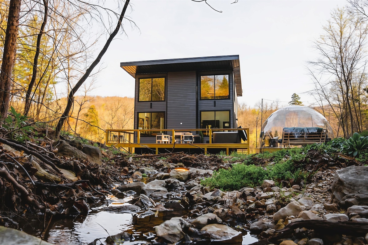 Szklana kabina nad strumieniem | Jacuzzi + basen z grotą + kopuła