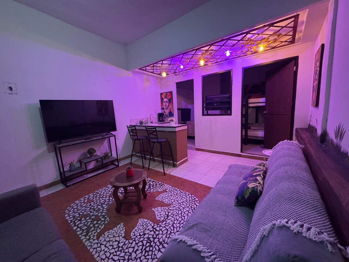 A pasos del centro y opción de acceso autónomo, 2 recámaras, ideal para 4 personas. Con cama king, matrimonial e individual y espacio de trabajo. Ambas tienen baño privado, tv, clima y wifi. En área común: mesita comedor para 2, barra para 2, salita, frigo, micro, cafetera, utensilios, licuadora y área para lavar trastes. Ambiente 100% familiar, no se permiten fiestas. A partir de 4 huéspedes se abre la segunda estancia.