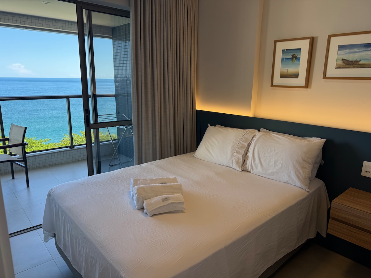 Apart decorado com vista magnífica da Baía de Todos-os-Santos, em Ondina, no circuíto do carnaval, perto do Farol da Barra e Rio Vermelho. Duas suítes com ar, sala, cozinha, Wi-Fi, serviço de camareira, recepção 24h e estacionamento rotativo na frete do Apart. Camas novas, roupa de cama e banho. Smart tv 43, geladeira, fogão, sofá-cama, micro-ondas, liquidificador, sanduicheira, cafeteiras: nespresso e arno e utencílios de cozinha. Piscinas, bar, padaria, retaurantes, lojas, galeria e salão.