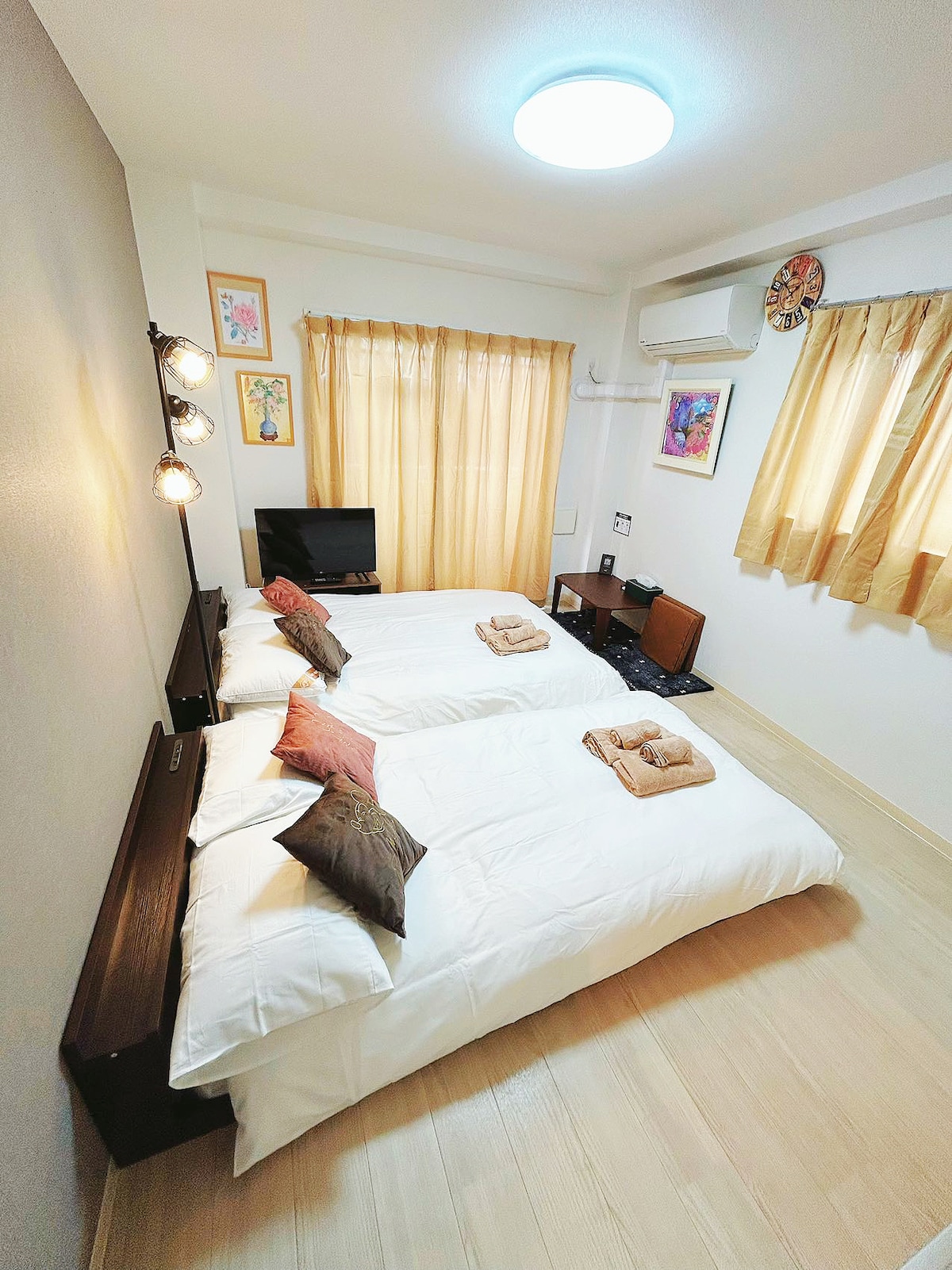 Mimi House Makuhari znajduje się w bardzo dogodnej lokalizacji pomiędzy Naritą a Tokio, 1 minutę od stacji Keisei Makuhari i 4 minuty od stacji JR Makuhari. Ponadto, z dworca Kaihin Makuhari, na który przyjeżdża autobus limuzynowy z lotniska Narita, można do nas dojechać taksówką w około 5 minut. W pobliżu znajduje się duży supermarket Ito-Yokado, największe centrum handlowe w Japonii, Makuhari Seaside Park z japońskim ogrodem, a także Makuhari Messe i Tokyo Disneyland. Do dyspozycji gości są również dwa rowery, które można wykorzystać do zwiedzania Makuhari. Możesz z nich korzystać podczas swojego pobytu. (Pamiętaj, aby zablokować, aby zapobiec kradzieży) Ponadto w pokoju znajduje się łóżko typu queen oraz typowy japoński stół kotatsu (latem stół do siedzenia), dzięki czemu można wygodnie spędzić czas, oglądając telewizję lub jedząc, siedząc na niskiej sofie. Można również położyć futon i spać, więc może tu mieszkać maksymalnie 3 osoby. (Należy pamiętać, że jeśli masz dużo bagażu, może być dość ciasno) Możesz cieszyć się komfortowym pobytem, doświadczając japońskiego kotatsu (w sezonie letnim chabudai).
