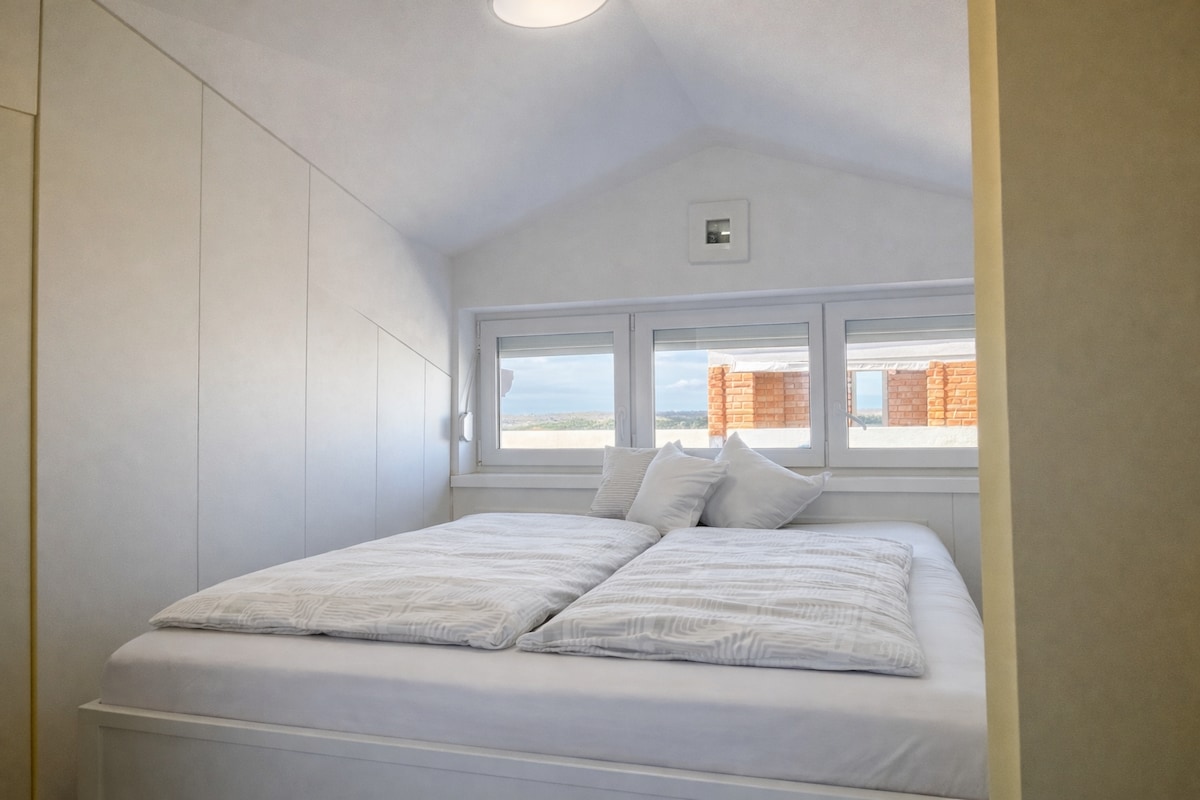 Novi apartman, moderno uređen. Sadrži sve potrebno za jednu obitelj (dvije spavače sobe, kupaonica, dnevni boravak, kuhinja, velika terasa na krovu sa pogledom na more). Na terasi se nalazi solarni tuš pergola sa stolom, stolicama i roštiljem. Apartman ima poseban ulaz i vlastito parkiralište. Nalazi se 700 metara od plaže, tržnice i trgovačkog centra. 800 metara od centra grada i niza restorana i ugostiteljskih objekata.
