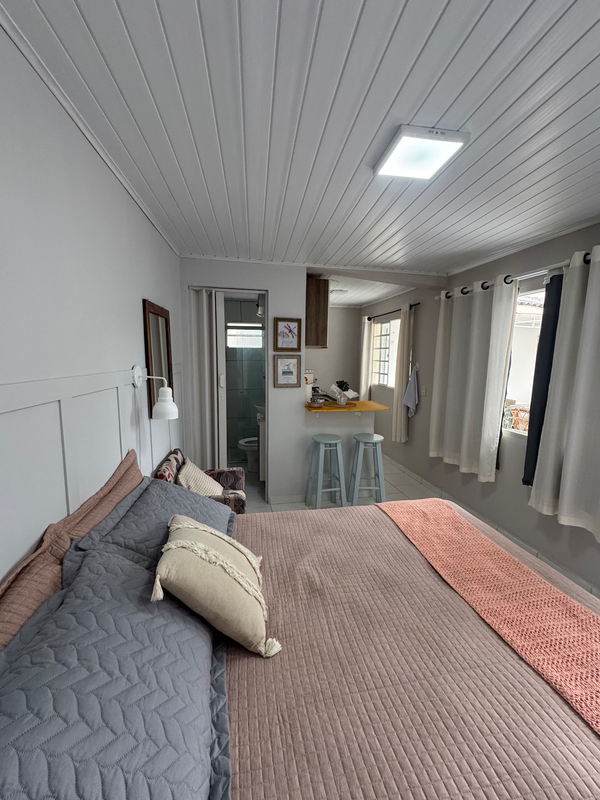 Lugar pequeno com o essencial para uma estadia breve e confortável, é cobrado por pessoa e por noite. A kitnet fica na parte térrea do meu sobrado, entrada individual. Somente os hóspedes têm acesso ao local, a casa é germinada mas não é compartilhada. Banheiro pequeno porém funcional. Cozinha completa com todos os utensílios necessários para cozinhar. Possui uma vaga para carro, não é coberta mas é segura. Não aceitamos pets no local.