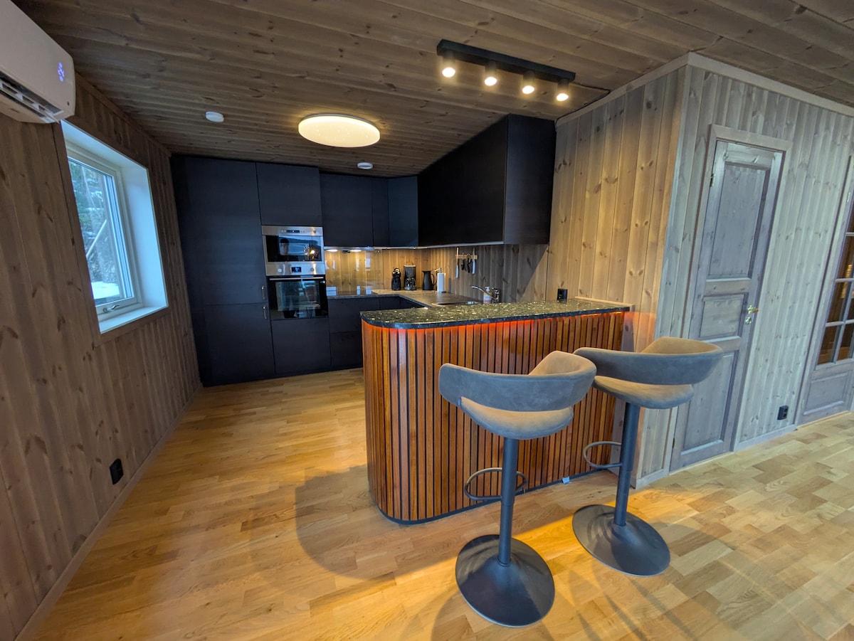 Wyjątkowa chatka nad morzem. Bardzo nowoczesne i w pełni wyposażone. Niesamowity widok na fiordy. Chatka znajduje się 10-15 minut poza centrum miasta, a autobus odjeżdża co godzinę. Przystanek autobusowy oddalony o 1 minutę jazdy. Domek ma 28 m2 i jest dostępny dla maksymalnie 2 osób. Na górze antresola z łóżkiem dostępnym po drabinie i wygodną kanapą do spania poniżej. Bezpłatny parking przy drodze i tylko 1 minuta spaceru w dół małego wzgórza do domu. Korzystanie z jacuzzi kosztuje dodatkowo, w zależności od liczby dni. Zakaz palenia i organizowania imprez.