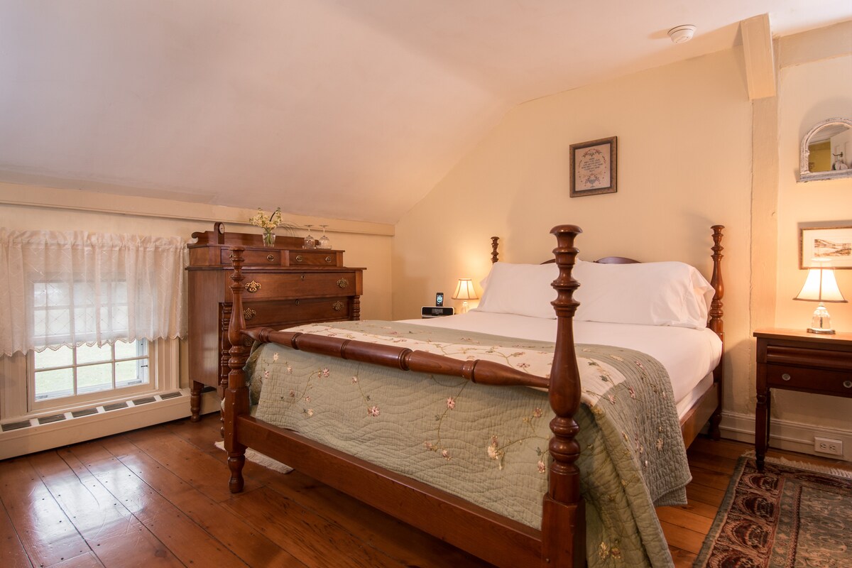 The Caldwell House is located in the heart of the lower Hudson Valley near West Point, Storm King Art Center, Brotherhood Winery and the Woodbury Common. Inspired by Dutch colonists’ original name for Storm King Mountain, the Butter Hill Room evokes the region’s history with beautiful 19th century details. This charming room offers a lovely queen-size sleigh bed, love seat, antique English armoire, Empire-style bureau, historic engravings hanging on the walls painted with colors that remind you of the buttercups that line the local fields, and a roomy private en-suite bathroom with a shower.