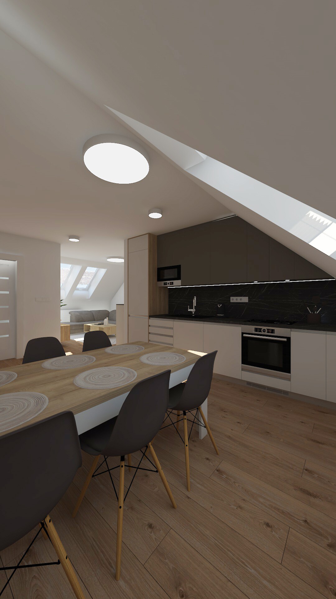 Studio shelter house o powierzchni 33 m kw. z balkonem w wysuniętym lukarnie, z pięknym widokiem na Tatry Zachodnie. Przestronne, 4-metrowe wnętrze wykończone drewnem modrzewiowym. Łóżko typu "king size" 180x200cm z opcją rozsuwania na 2 pojedyncze. Aneks kuchenny ze zmywarką, lodówką, mikrofalą, tosterem ekspresem do kawy. Rozkładany fotel-sofa o szerokości 100cm czyni studio wygodne dla 2 osób lub 2 os z dzieckiem. Wanna w otwartej przestrzeni, toaleta z umywalką w oddzielnym pomieszczeniu.