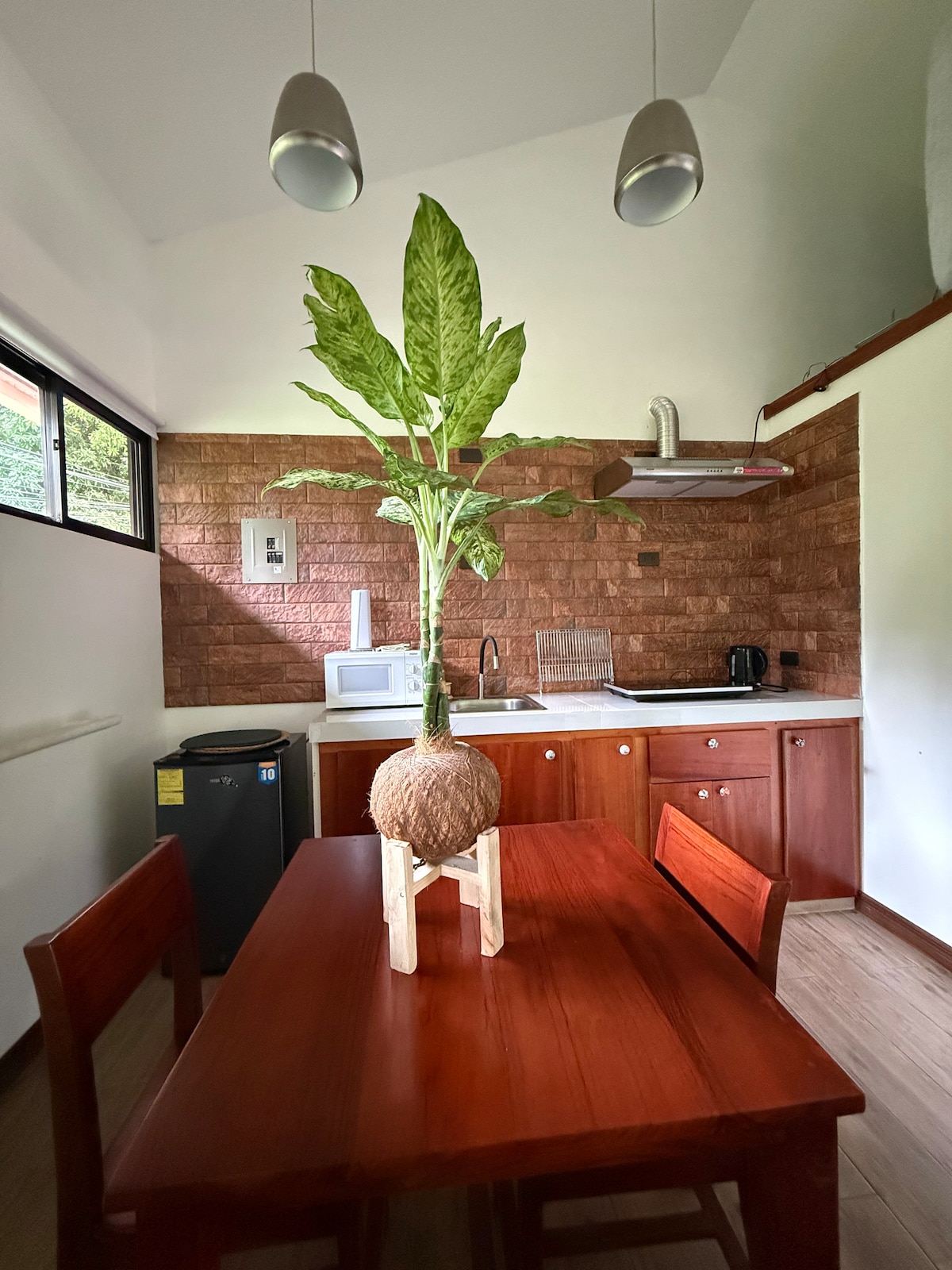 This spacious tree house-style bungalow sleeps up to 4 guests amid lush tropical greenery. It features a bedroom with a double bed, a bright living area with a fully equipped kitchen, private bathroom, and a sofa bed for two. A ladder leads to a gallery with space for two extra mattresses. The large balcony offers stunning jungle views and birdwatching. Access to the nearby pool area is just steps away for relaxing and enjoying the surroundings.