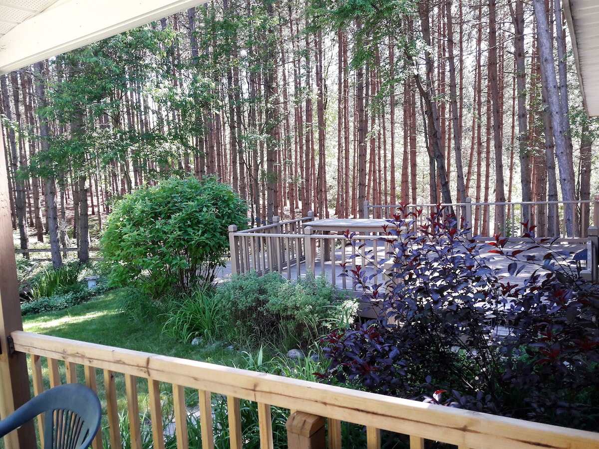 Będziesz mieć do dyspozycji całą piwnicę - dwie sypialnie, łazienkę, małą kuchnię i salon. Jesteśmy w lesistej okolicy kilka kilometrów od miasta. Będziesz mieć własne wejście na taras (widok na staw) z dostępem do paleniska. Jesteśmy blisko White Pine Trail. Uważamy, że to miejsce jest spokojne i przytulne. Na górę prowadzą schody, ale są zasłonięte i zakryte pianką, aby zapewnić prywatność. Będziesz mieć całe piętro i wejście dla siebie!
