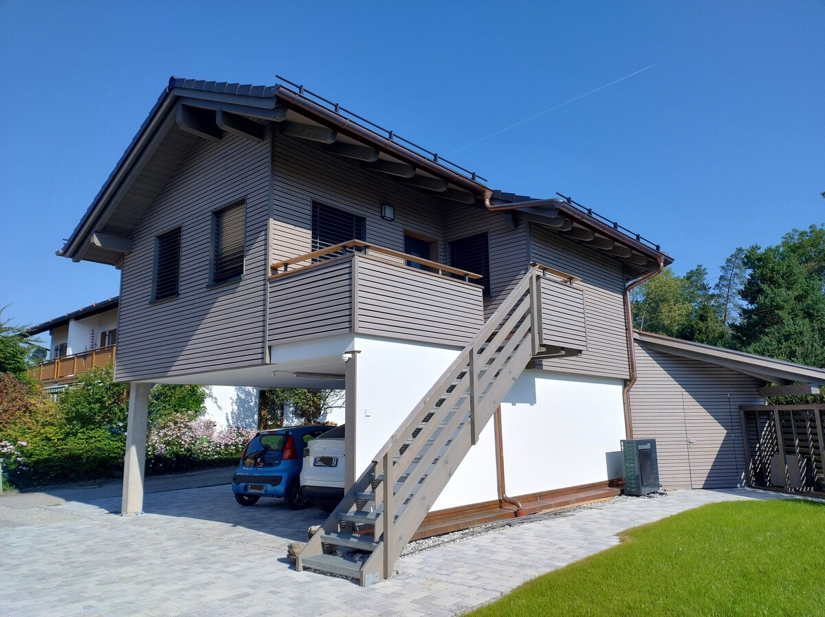 Nasz dom wakacyjny to przestronny, zalany światłem, wolnostojący dom architekta z dużym tarasem na dachu i purystycznym ogrodem na zboczu wzgórza. Z tarasu na dachu roztacza się wspaniały panoramiczny widok na Alpy i Zugspitze. Nasz dom oferuje w pełni wyposażoną otwartą kuchnię. Dla relaksu dostępna jest bezpłatna kabina parowa na podczerwień i jacuzzi. Dom jest przyjazny dla klimatu dzięki systemowi fotowoltaicznemu, akumulatorowi i pompie ciepła.