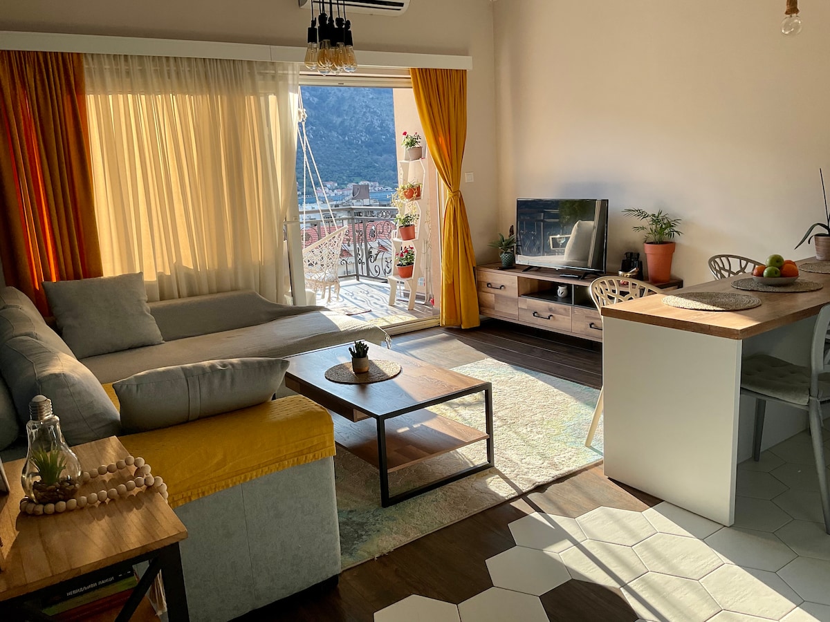 Apartment with a balcony and a great view! Free parking in front of the house is always available. It is located in a quiet residential area 400m from the sea and 10- 15 minutes' walk from the Kotor old town. A big supermarket is a 3-minute walk from the house, and a hiking trail to Vrmac Mountain is a 5-minute walk. The House location is easy to find if you come with your own car. If you arrive by bus, you can reach us in 15 minutes' walk. There is a local bus stop in front of the house.