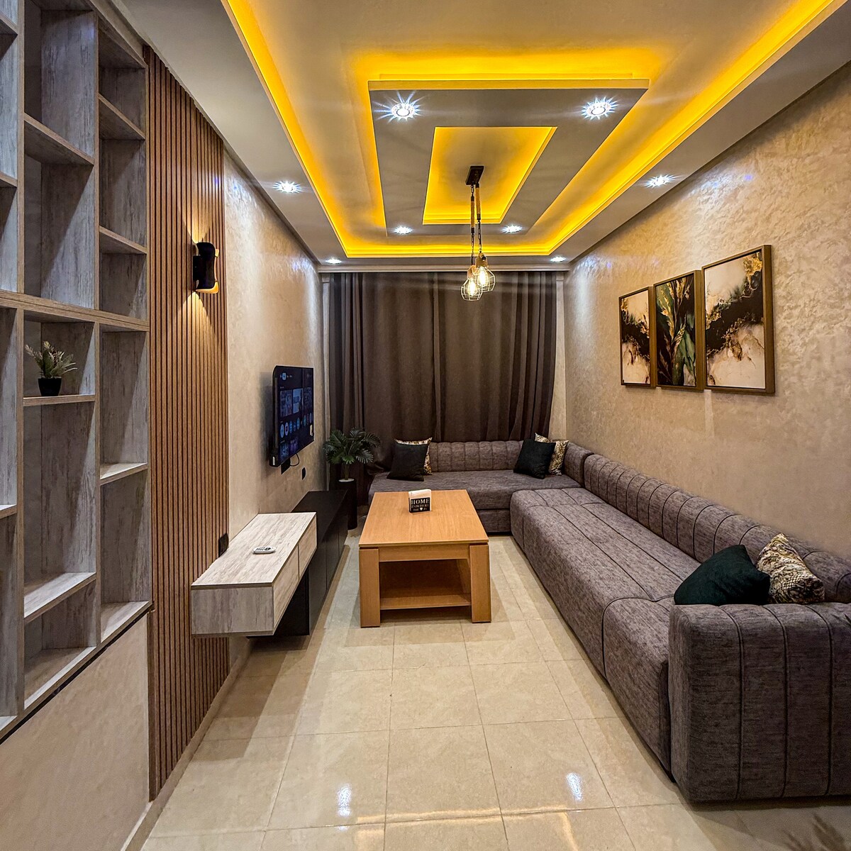 Witamy w naszym nowoczesnym, przytulnym mieszkaniu, w którym komfort łączy się ze stylem. Ciesz się jasnym salonem z granatowymi sofami, elegancką kuchnią i jadalnią dla sześciu osób. W apartamencie jest szybkie Wi-Fi, telewizor z płaskim ekranem (Bein Sports, IPTV) i elegancki wystrój. Duże okna wypełniają go naturalnym światłem i spokojną energią. Zaledwie 3 minuty do dworca kolejowego, 2 minuty do Carrefoura i 5 minut jazdy do plaży i centrum miasta… (nie wolno niezamężnym parom) Idealne na krótkie lub długie pobyty.