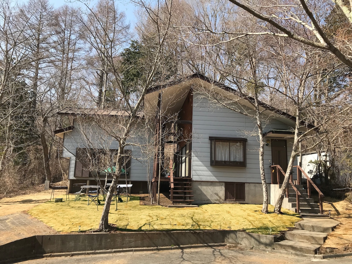 閑静な別荘地にある築30年のフィンランドログハウス。 別荘地内にあります。良く言えばプライベート感のある立地。 BBQ、屋外では焚火。 BBQグリルは有料で貸出しております 敷地内リフォームしつつ営んでおります。工事中の箇所もありますが施設は快適に過ごせるようになっております。 尚、冬期は暖房費がかかります。 湖畔までは徒歩10分貸自転車あります。 Our guest homes are a finland style loghouse built 30 years ago. We are located in a quiet and relaxing area with lots of wildlife including wild birds, deer and squirrels, bear, badger. We are always open as we update our guest homes. Guest homes include kitchen, bathroom and outside BBQ and fire pit area.
