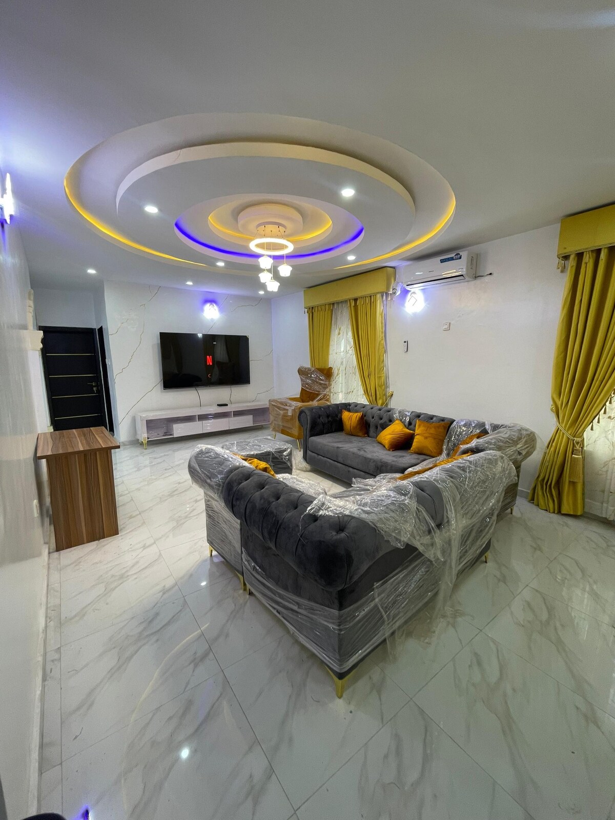 To dwupokojowe mieszkanie w jednej z najbezpieczniejszych i najspokojniejszych dzielnic Ibadanu. Możesz poczuć ciszę i spokój, gdy tylko wejdziesz do obszaru rezerwowanego przez władze. To w pełni klimatyzowane mieszkanie z salonem i telewizorem. Znajdują się tu dwa pokoje, każdy z łóżkiem typu queen-size oraz łazienką i toaletą. W pełni wyposażona kuchnia ze wszystkimi niezbędnymi sztućcami. Zasilanie w trybie gotowości. Osoba sprzątająca i ochroniarz zawsze pod ręką, aby pomóc Ci we wszystkim, czego potrzebujesz.