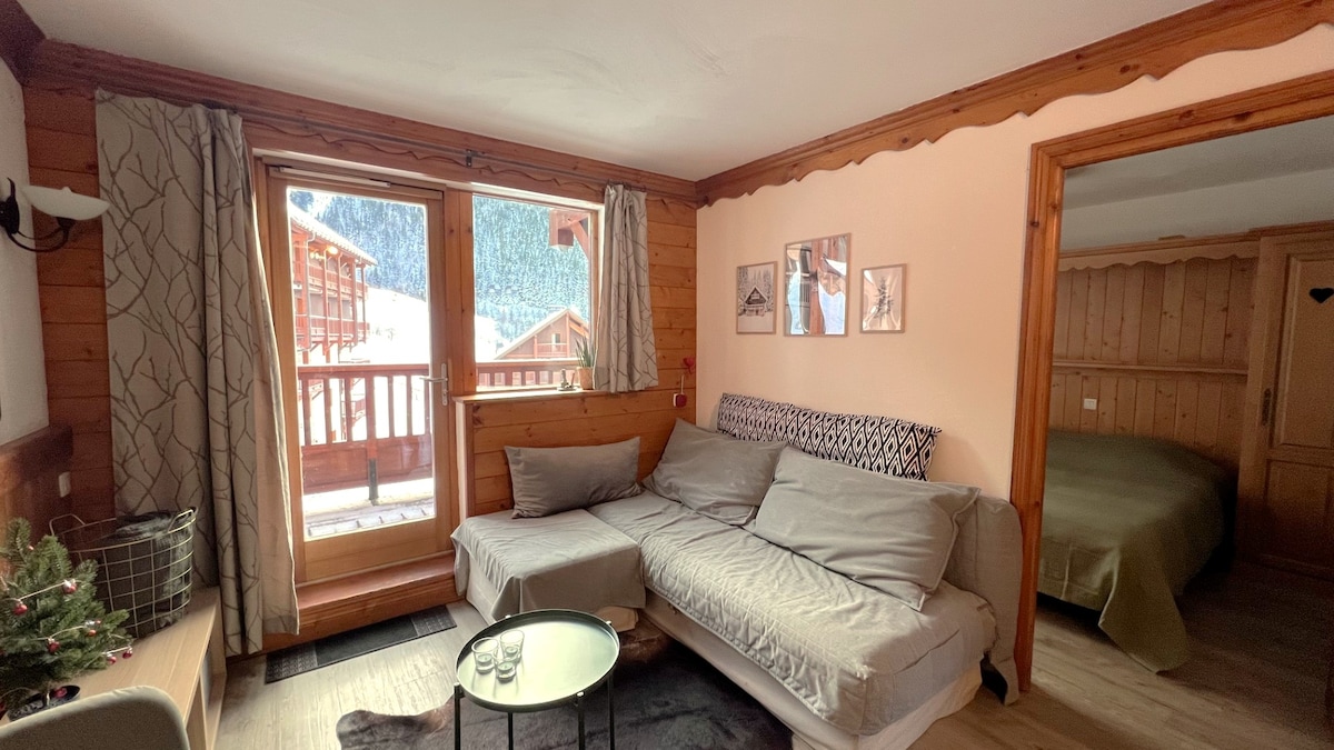 Mała pracownia dla 4 osób, w samym sercu tej rodzinnej stacji narciarskiej w pobliżu wszystkich udogodnień, w tym 3 wyciągów narciarskich, otwarta zimą i latem, dostęp do 249 km Grand Domaine. Główna przestrzeń mieszkalna: rozkładana sofa, która zamienia się w podwójne łóżko, telewizor i Wi-Fi, stół i cztery krzesła oraz mała kuchnia. Ponadto ma łóżka piętrowe, łazienkę, oddzielną toaletę, duży balkon od strony zachodniej z wspaniałymi widokami. Mamy jeszcze 2 inne apartamenty, jeden naprzeciwko, a drugi na tym samym korytarzu. Można je rezerwować razem.