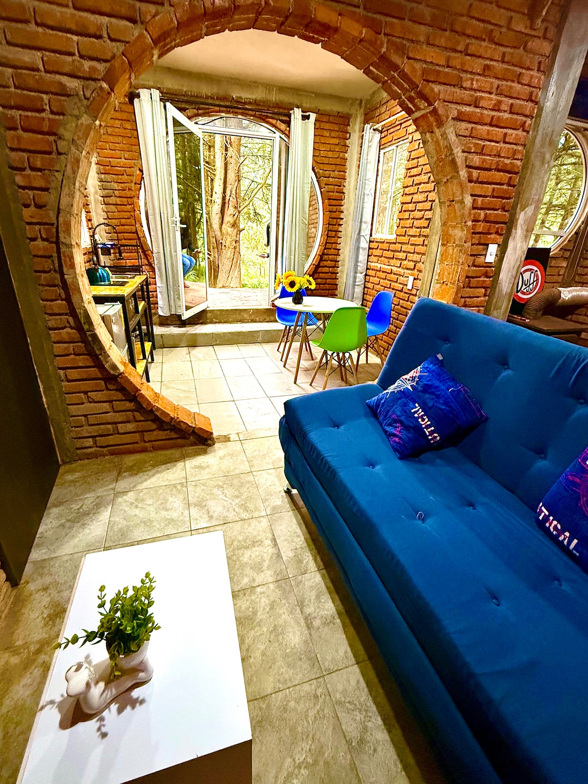 Domek A-Frame o wyjątkowym i przytulnym wystroju znajduje się na terenie należącym do rodziny w La Estanzuela, zaledwie 20 minut od Pachuca w Hidalgo. Idealne miejsce, aby cieszyć się spokojem na łonie natury, poznać projekty i działania realizowane na terenie obiektu oraz odkryć atrakcje na świeżym powietrzu oferowane przez Park Narodowy El Chico.
