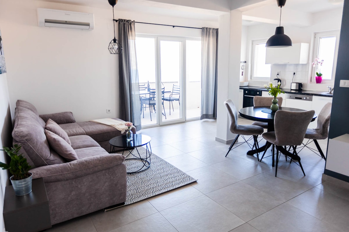 Enjoy the beautiful sea view with a glass of good Croatian wine in a family and friendly environment. Ideal for romantic walks by the sea . The facility is located in a quiet family village Diklo. Near the house there is a church, the distance from the beach and promenade is around 100 m as well as from the nearby caffe bar, grocery store,restaurant and children playground. The city center is only 6 km away, the nearest airport is Zadar Airport, 16 km away from the apartment.
