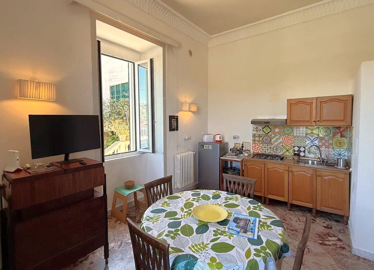 Dom z własnym wejściem jest częścią częścią „wiejskiego” budynku z początku XX wieku. Prywatna łazienka, podwójne łóżko, rozkładana sofa, lodówka, telewizor, Wi-Fi i romantyczna weranda z „widokiem jak z pocztówki”, gdzie można wypić drinka, napar, zjeść śniadanie, a nawet zainspirować się i wykorzystać ją jako „stanowisko pracy”. Dostęp jest łatwy z ulicy lub z parkingu (ewentualnie dostępnego), przez ogród cytrynowy, prywatny dziedziniec i kilka schodów.