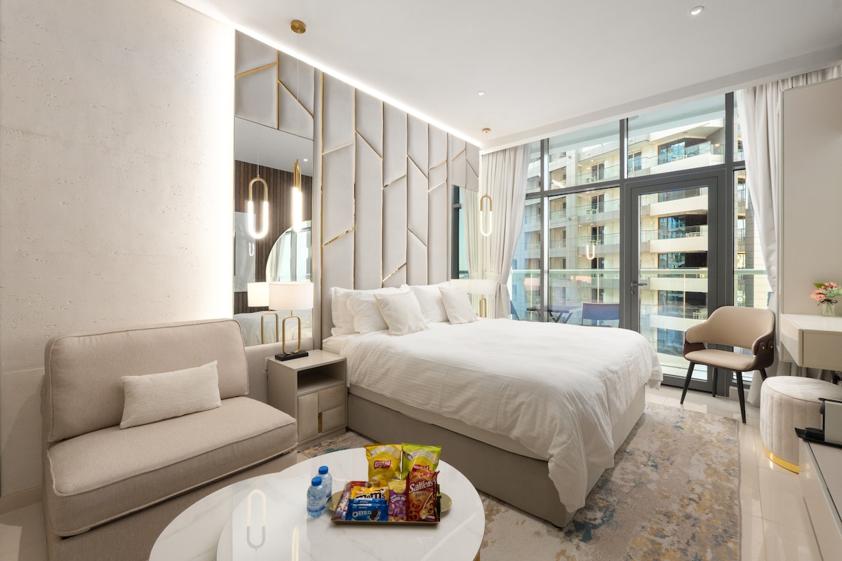 Our thoughtfully designed Studio Apartment is located in the heart of Dubai's Palm Jumeirah, just opposite the famous Nakheel Mall. The studio apartment has a fully equipped kitchen and is situated within a fully-serviced 5-Star lifestyle hotel, the Andaz Dubai The Palm by Hyatt. The apartment provides you with access to a range of amenities, such as an adults-only pool area on the rooftop of the building, as well as access to the community's beach and family pool overlooking Burj Al Arab.