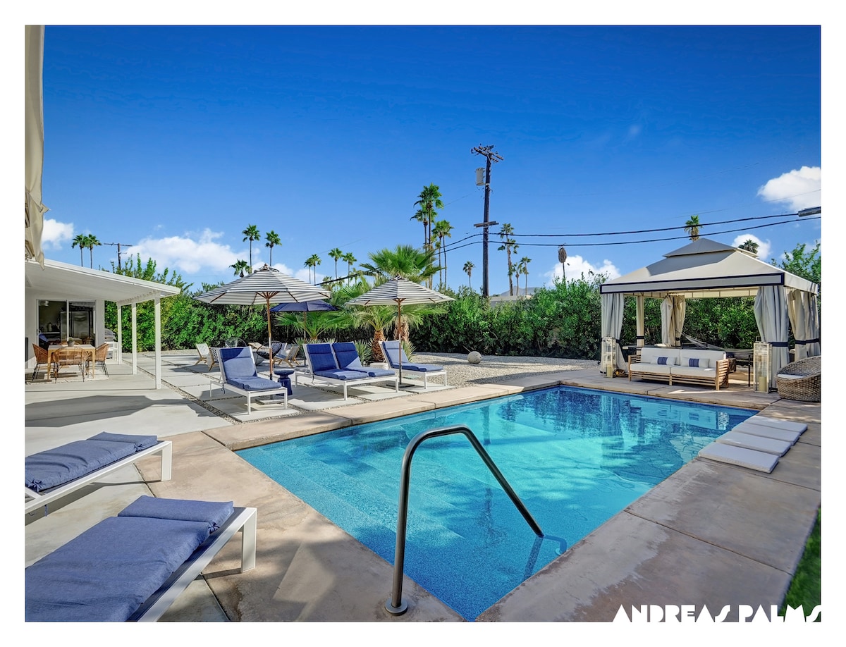The Palmetto House - A Luxury + Mid-Century Oasis with a private resort-like pool with cabana, fire-pit, hot tub & amazing views of the San Jacinto mountains located about 2 miles from Downtown Palm Springs. This mid-century modern home was designed by legendary Architect James Cioffi and offers a spacious layout and seamless flow to the pool area. High ceilings and windows let tons of natural light flow in creating an oasis both inside and outside.
