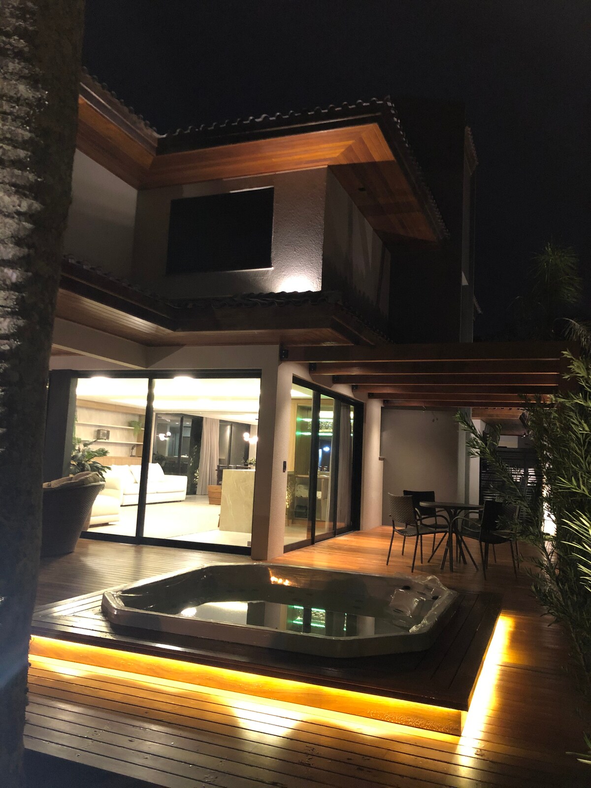 Piękny, nowoczesny i przytulny dom. Wyposażona kuchnia z dużym urządzeniem do warzenia piwa i grillem na węgiel drzewny. Wszystkie pokoje wyposażone są w klimatyzację, telewizor Smart TV i zautomatyzowane rolety. Ogrzewane spa na dużym tarasie przed domem. Położony 150 m od centrum handlowego Jurerê Open i 200 m od plaży, w kierunku kortów do tenisa plażowego.