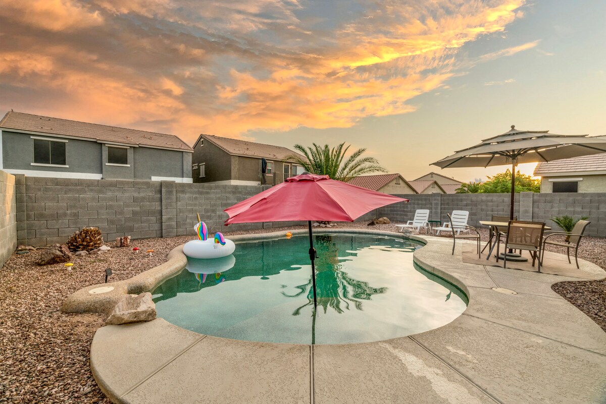 Miejsce na pobyt i odpoczynek dla rodziny. Położony w Buckeye AZ, zaledwie 35 minut od Phoenix. 2 sypialnie 2 łazienki z rozkładaną kanapą, wygodnie mieszczą 6 osób. Dużo pieszych wycieczek w pobliżu, jeziora i sklepy. Ciesz się naszym basenem (sezonowo), miejscem do grillowania, zielenią i paleniskiem. W nocy lampki sznurkowe zapewniają wystarczającą ilość światła do nocnych aktywności. Blisko toru wyścigowego Phoenix, wiosennych treningów i stadionu Cardinals.