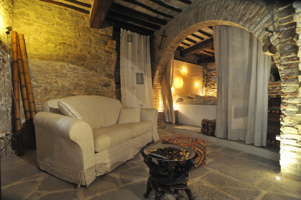 Un rifugio ipogeo unico, incastonato nelle mura medievali di Panicale, che fonde l'asprezza della roccia con un design accogliente e raffinato. 🧱 Caratteristiche Principali Struttura: Una vera grotta abitativa con pareti in pietra nuda, archi in mattoni e soffitti a volta che creano un'atmosfera protettiva e senza tempo. Ambiente: Monolocale open space intimo e romantico, dove ogni nicchia scavata nella roccia è sfruttata per creare angoli funzionali (cucina, zona notte, relax).