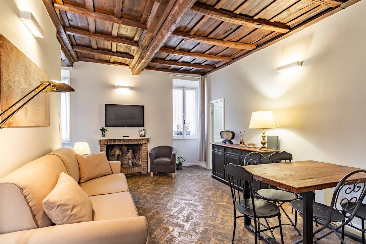 W centrum Rzymu prywatny apartament na ostatnim piętrze z żaluzjami w oknach salonu, które wpuszczają światło i umożliwiają podziwianie widoków na centrum Rzymu i Bazylikę św. Piotra. Zabytkowy kominek, płytki z terakoty tworzą tradycyjny klimat. Prywatny taras w pełni umeblowany. Dwie sypialnie z podwójnym łóżkiem. Dziesięć minut spacerem od placu św. Piotra i Muzeów Watykańskich. Widok na Rzym i Bazylikę św. Piotra. 2 minuty spacerem do komunikacji miejskiej, autobus i metro zabiorą Cię łatwo do wszystkich głównych zabytków.