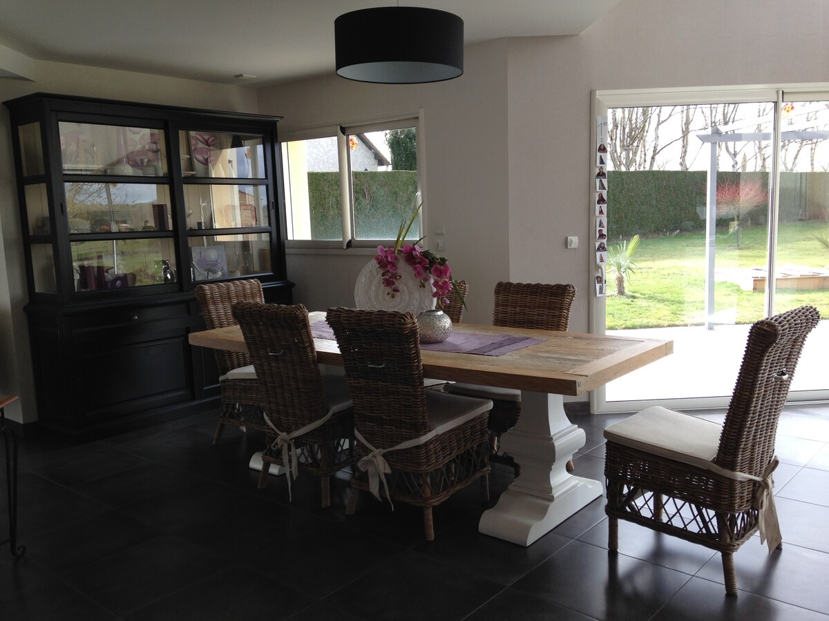 Witamy w naszym domu położonym 15 minut spacerem od toru wyścigowego Le Mans i jego muzeum, 25 minut autobusem od centrum miasta Le Mans i 5 minut od centrum wystawowego, sali Oasis. Do dyspozycji gości jest pokój na piętrze, łóżko 160x200 z dostępem do łazienki. Weranda lub kuchnia do picia kawy, herbaty... Prywatny ogród i parking, garaż dla motocykli. Możliwość naładowania pojazdu na wallbox 3KW (za dodatkową opłatą) Mówimy po francusku i angielsku.