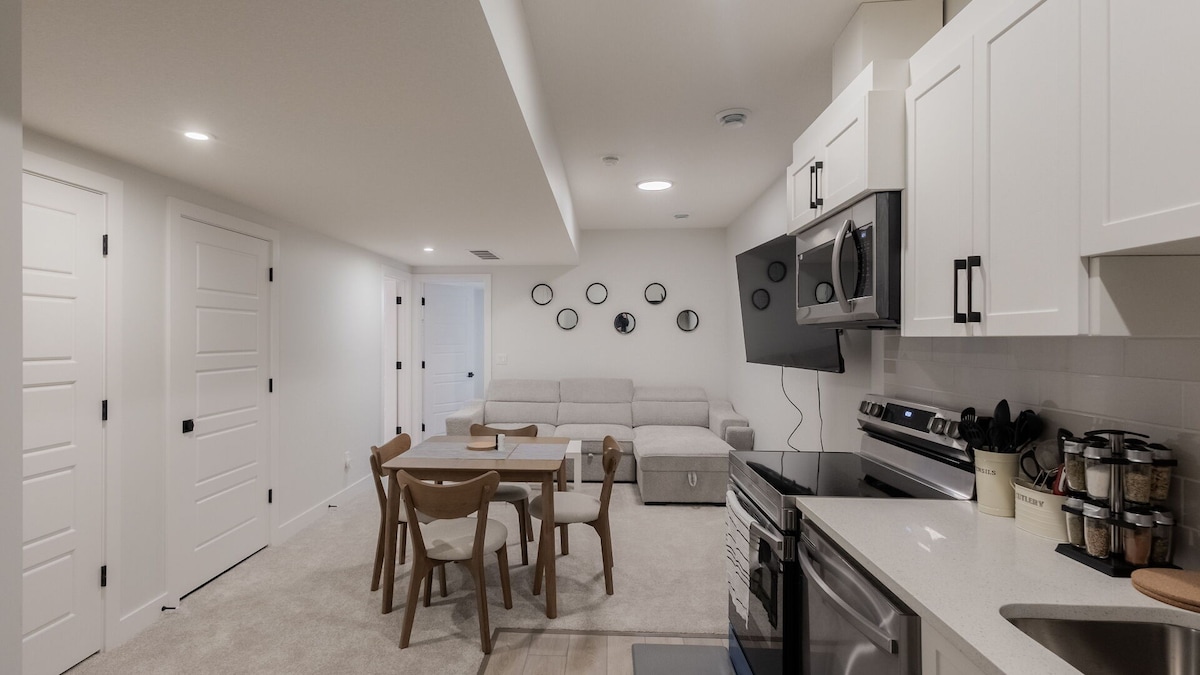 Our newly-renovated and romantic NYC loft-inspired basement suite offers over 1000 square feet of luxurious living space. With its high ceilings, floor-to-ceiling glass walls and French doors, and cozy in-floor heating, you'll feel like you're in a real loft. The high-end kitchen and bathroom add a touch of sophistication, and the 90s Simpsons arcade game provides hours of entertainment. Book your stay with us and experience the luxury and comfort of our suite.