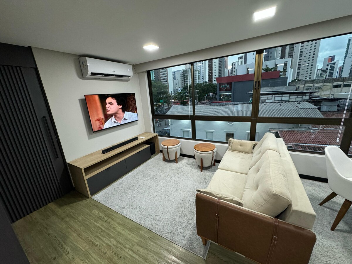 Przyjedź i skorzystaj z tego pięknego apartamentu przy centrum handlowym w Recife. Moje miejsce jest dobre dla par, samotnych poszukiwaczy przygód i osób podróżujących służbowo. Studio znajduje się na 26. piętrze, wyobraź sobie ten wspaniały widok! Szczegóły: - Klimatyzacja - Szybkie Wi-Fi - Smart TV z Netflix - Średnie łóżko (queen) - Pościel i kąpiel wliczone w cenę - Gorący/zimny prysznic - 1 miejsce garażowe - całodobowa portiernia - Zamek cyfrowy