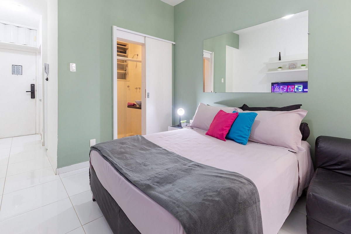 Odnowiony i elegancko urządzony apartament; ciche podwórko 1 przecznicę od plaży Copacabana (Posto 5), 2 klimatyzatory, zamki elektroniczne, całodobowy portier. Wiele sklepów, takich jak sklepy spożywcze, apteki, supermarkety, restauracje, siłownia, banki, znajduje się w odległości mniejszej niż 2 przecznice. Apartament położony 15 minut od Ipanema i Lagoa (spacer). Posiada 1 łóżko podwójne (sypialnia) i 1 rozkładaną sofę (salon) dużą i wygodną.