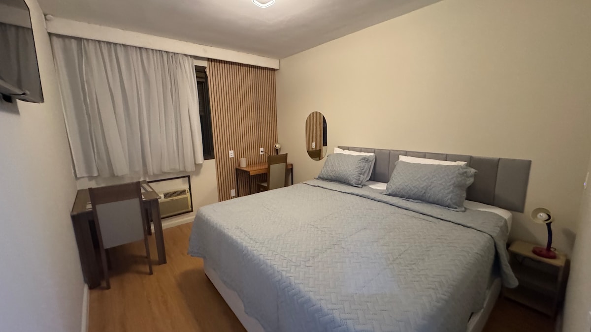 Niezależny dostęp do małej przestrzeni (11 m ²) z klimatyzacją, zlewem z 2 palnikami, lodówką i kuchenką mikrofalową. Prywatna łazienka. Telewizor kablowy i Wi-Fi, 500 m od metra Siqueira Campos i 2 przecznice od plaży. Nowa przestrzeń dla wszystkich emerytów. Pomieści do 2 osób.