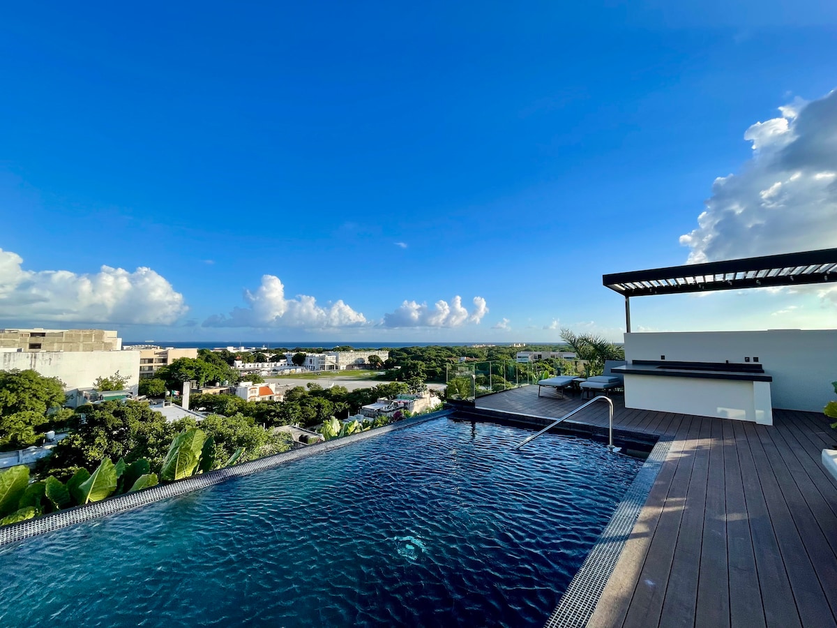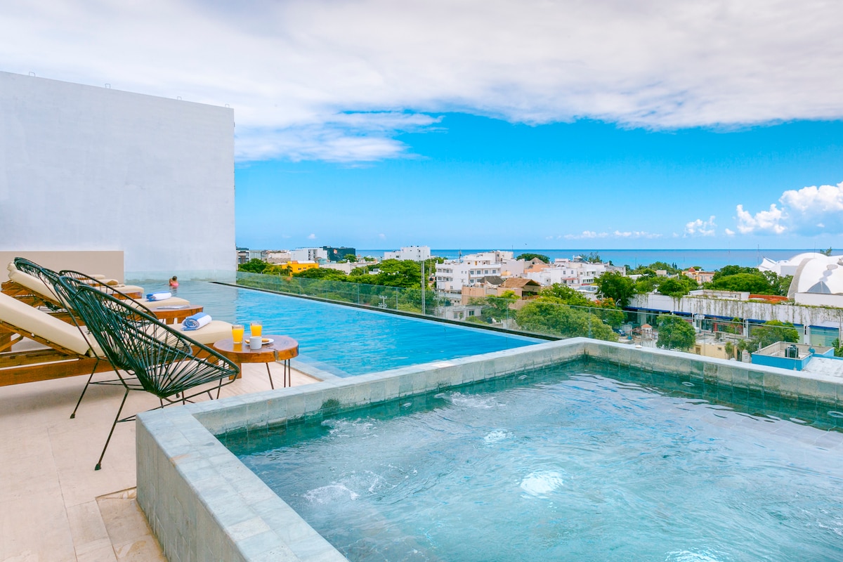 Zatrzymaj się w samym sercu Playa del Carmen! Ten stylowy apartament dla 3 osób posiada łóżko typu king size, rozkładaną sofę, pełną kuchnię, jadalnię, klimatyzację, Wi-Fi, telewizor Smart TV i prywatny balkon. Zaledwie 2 przecznice od 5th Ave i 3 przecznice od plaży i promu do Cozumel, położone tuż pod słynnym placem Paseo del Carmen. Korzystaj z najlepszych udogodnień, takich jak dach z widokiem na ocean, basen bez krawędzi, jacuzzi, siłownia, centrum biznesowe, całodobowa ochrona, winda i podziemny parking. Wysokie standardy sprzątania.