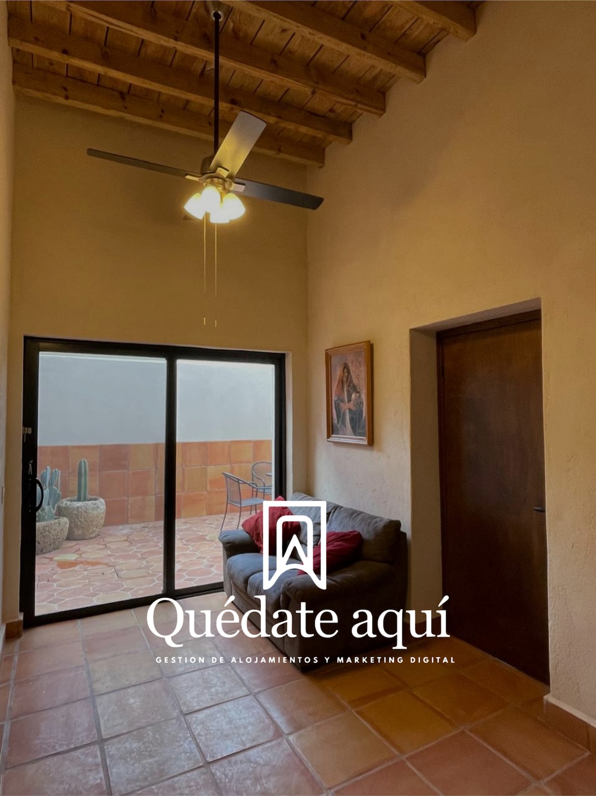 Linda casita con opción de una 3a recámara con baño (para 2 personas extras) Tiene un patio central con asador, mesa de jardín, con iluminación. Cuenta con cocina equipada con estufa, horno de microondas, vajilla y cuchillería, en el comedor una chimenea, clima mini split frío/calor, sala hay dos sofás con una TV de 55” con conexión a internet y cuenta con el servicio de Netflix . Todas las áreas con abanicos de techo y la sala-comedor y las dos habitaciones con minisplit f/c